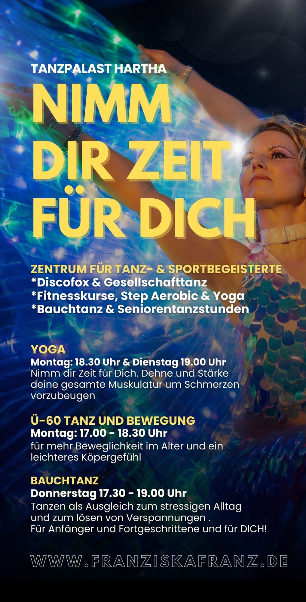 Tanzen als Ausgleich zum stressigen Alltag und zum lösen von Verspannungen, denn dafür ist Bauchtanz ideal geeignet. Orientalischer Tanz mit und ohne Acessiores ud auch andere Tanzrichtungen. Für Anfänger, für Fortgeschrittene und für DICH! OHNE VERTRAGSBIDUNG 60 min 10 Euro Immer Donnerstag 17.30 – 19.00 Uhr im Tanzpalast Hartha