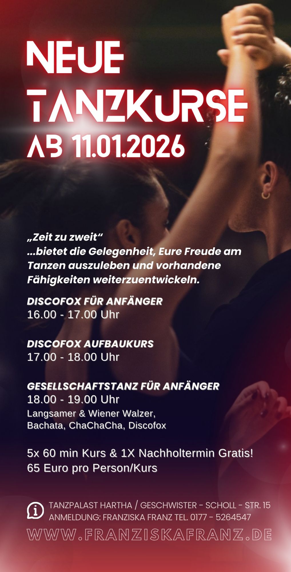 Vermittelt werden die Grundlagen im Langsamen Walzer , Wiener Walzer , Discofox , Cha Cha Cha und Bachata – kompakt, easy und perfekt für jede Tanzfläche! Termine :11.01.2618.01.2625.01.2601.02.2622.02.26Nachholtermin 01.03.26 5× 60 min und 1 Nachholstunde Gratis !Für 65 Euro pro Person Fragen & AnmeldungenFranziska FranzTel. 0177 5264547info@franziskafranz.de www.franziskafranz.de