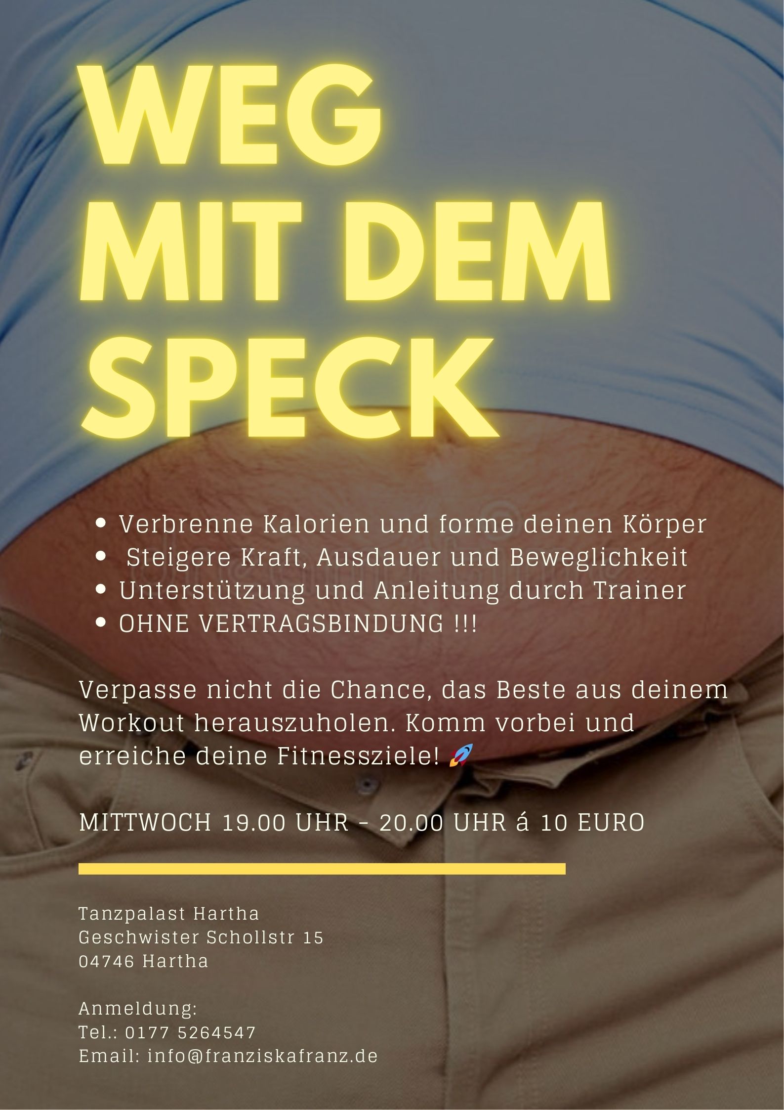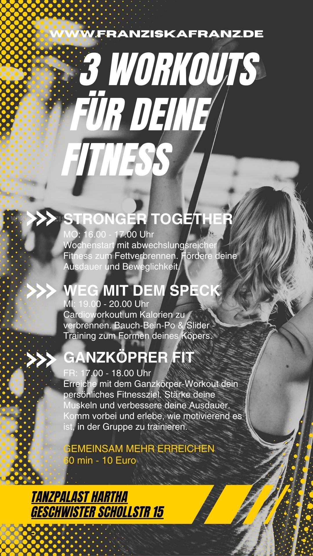 Erreiche mit dem Ganzkörper Workout deine persönlichen Fitnessziele. Stärke deine Muskel und verbessere deine Ausdauer. Komm vorbei und erlebe, wie motivierend es ist in der Gruppe zu trainieren. OHNE VERTRAGSBIDUNG 60 min 10 Euro Immer Freitags von 17 – 18 Uhr im Tanzpalast Hartha